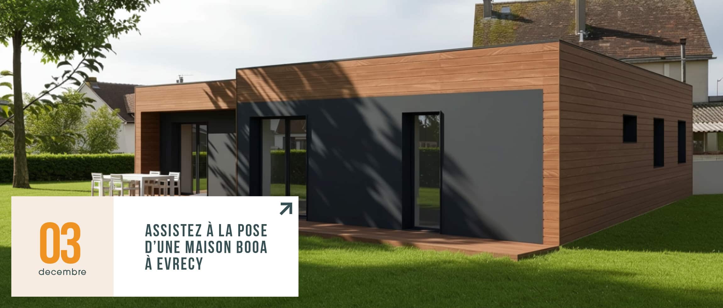 Nous vous donnons rendez-vous le 03 décembre pour vivre un spectacle impressionnant à Evrecy dans le Calvados (14). Toute notre équipe vous attend de 10h à 16h pour vous faire découvrir cette prouesse technique : la pose d’une maison booa !