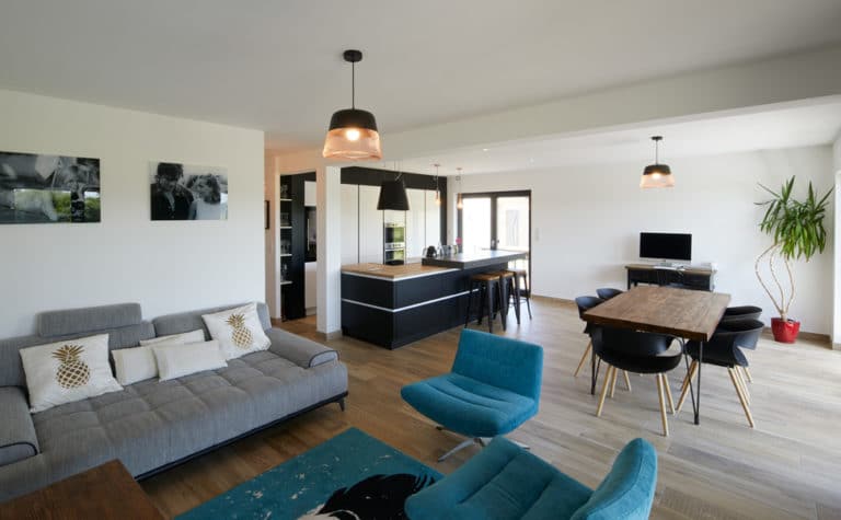 “Pour moi, il y a eu trois moments clefs. Tout d’abord, les plans : il y a des modèles prédéfinis que l’on peut personnaliser et adapter à nos envies. Cette phase de validation des plans était plutôt intéressante car elle a permis de se projeter, on imaginait comment meubler, comment vivre dedans… Ça m’a beaucoup plu, à tel point que je connaissais tous les plans par cœur ! Le deuxième moment clef, bien entendu, c’est quand la maison arrive sur de grands camions et qu’elle se monte presque intégralement en une journée : le terrain est vide quand on arrive le matin, et le soir, elle est déjà presque prête ! C’est impressionnant. Enfin, le dernier moment marquant a été la remise des clefs. On s’est dit « Ça y est, on peut enfin profiter de notre maison bois et design. »” Christine