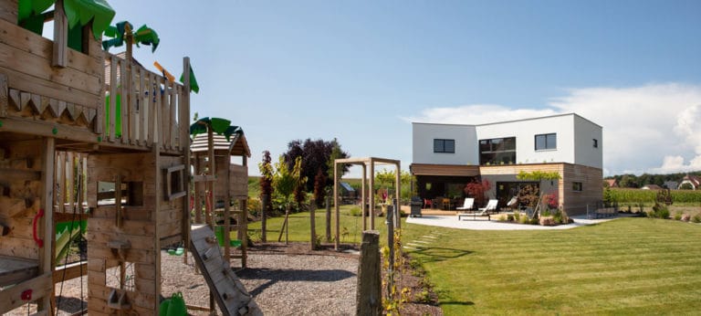 “Quand nous avons eu ce projet de construction d’une maison familiale, nous voulions dans un premier temps un endroit calme, à la campagne. Mais nous voulions également prendre en compte l’aspect écologique. C’est pour cela que nous nous sommes tournés vers les maisons à ossature bois. Deuxièmement, pour continuer dans cette optique, nous avons installé une cuve de récupération d’eau de pluie. Nous avons une cuve de 10m3 enterrée, qui est alimentée par tous les systèmes de gouttières et d’évacuation de la maison. Elle va nous permettre d’arroser le jardin, la pelouse sans utiliser l’eau de réseau. Et pour finir nous avions le souhait d’avoir une toiture végétalisée. Nous avons beaucoup de plantes qui attirent les abeilles, ce qui va permettre une pollinisation du jardin mais également d’avoir un petit écosystème sur les toits.” Émeline